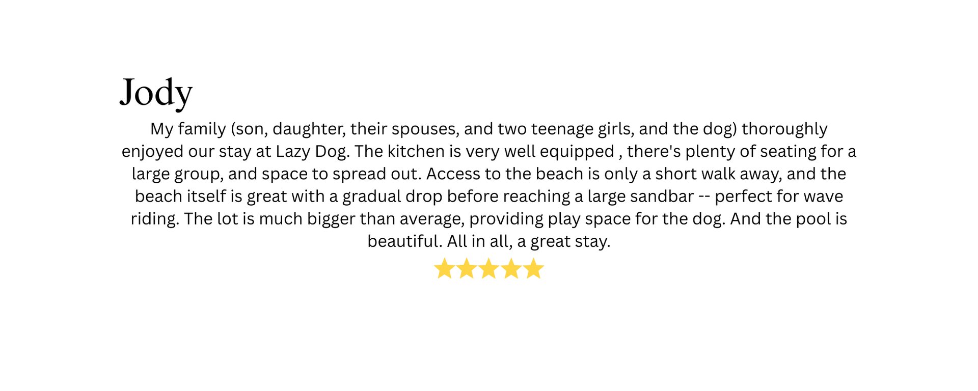 The Lazy Dog is an Open and Airy beach house with panoramic coastal views with tons of space for the whole family. 6 bedrooms (3 of which are Masters) and 5 Full Baths, with Sheets & Towels Provided. On the top level, relax in a Private Jacuzzi in the King Master Bedroom. All TVs are Flat Screens. The Rec Room with a Shuffleboard Table provides enjoyment for a great family vacation.